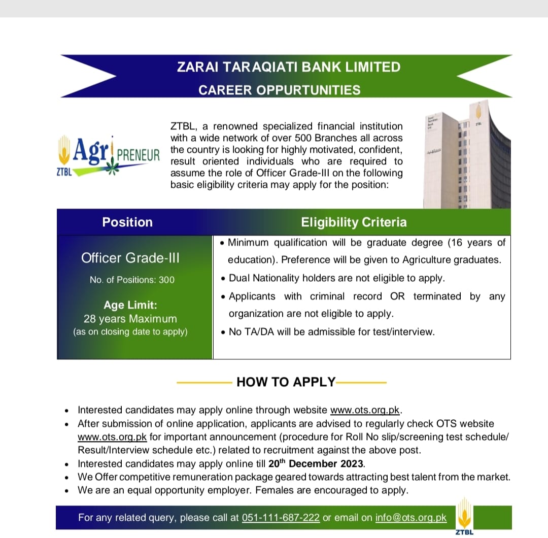 Career Opportunities in Zarai Taraqiati Bank Limited (ZTBL) ...Read more